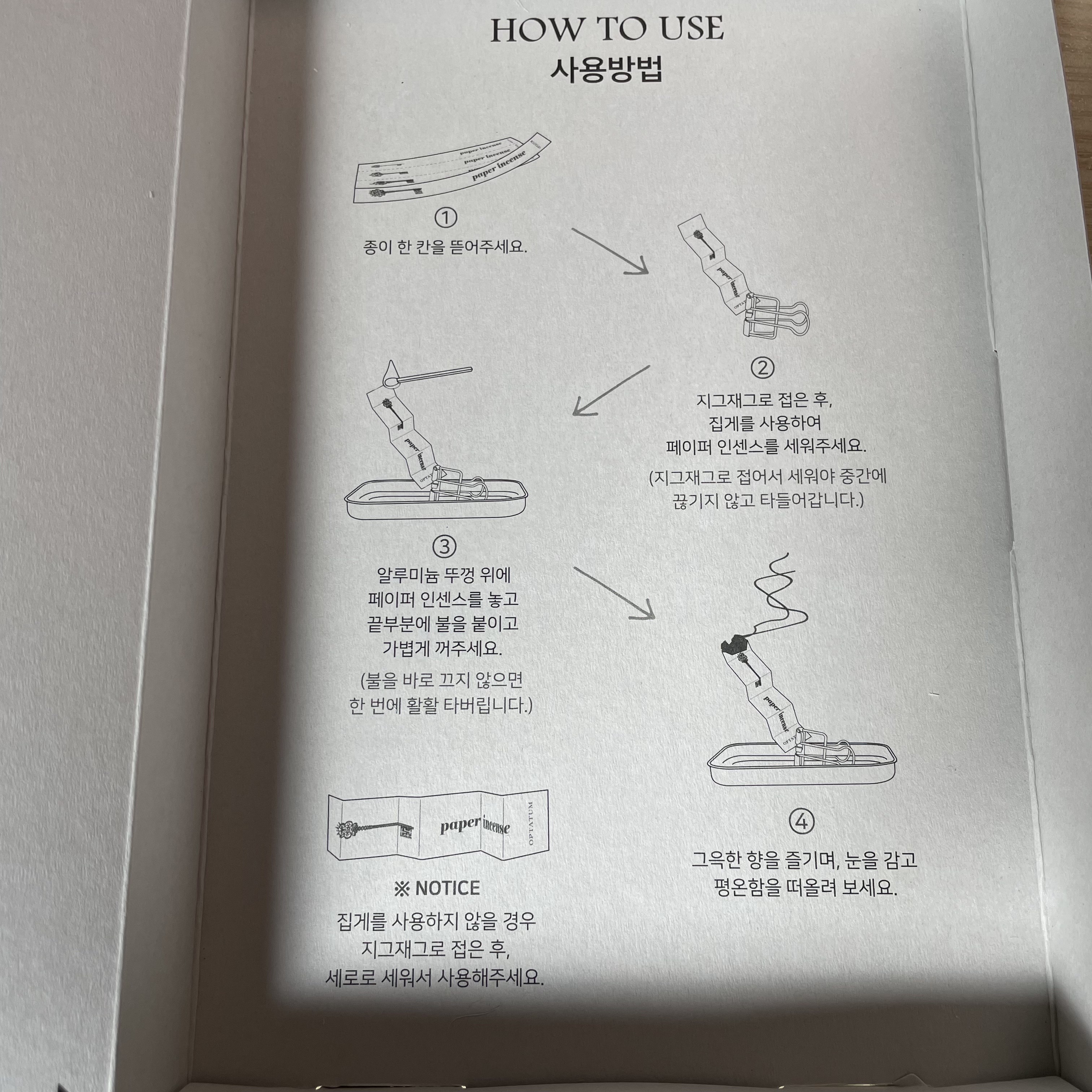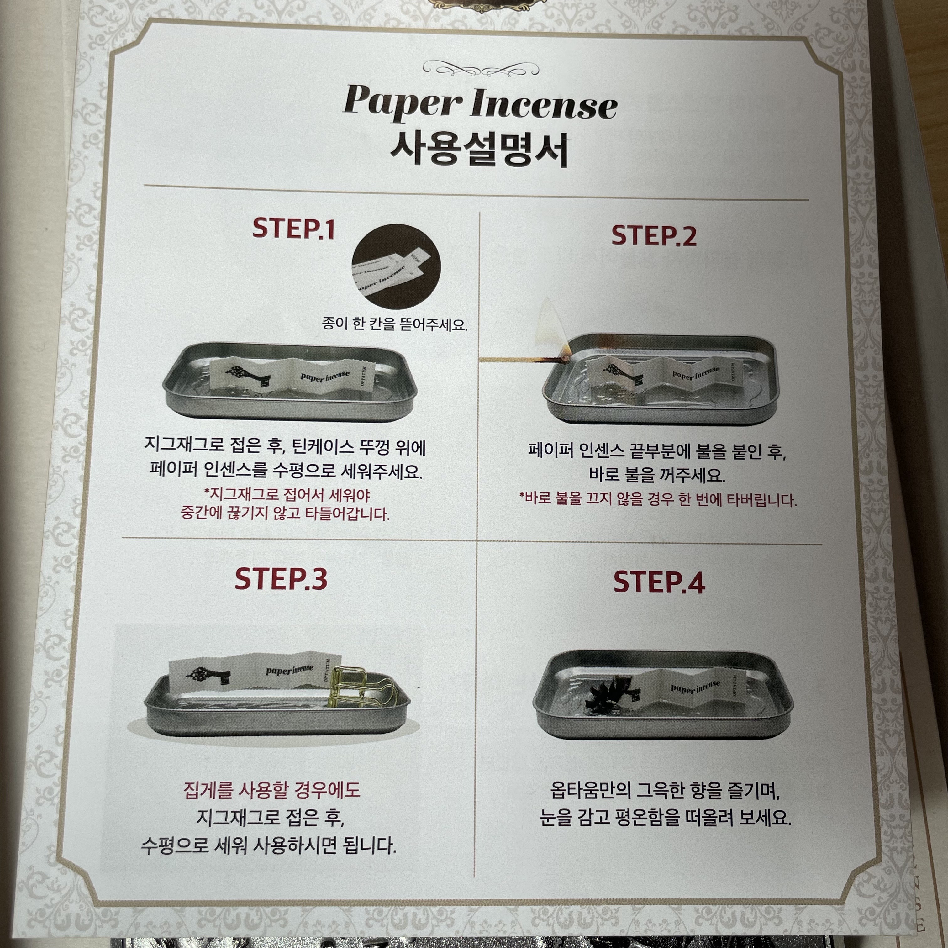 뒷면에서는 페이퍼 인센스 자체를 어떻게 사용하는지 알려줍니다.